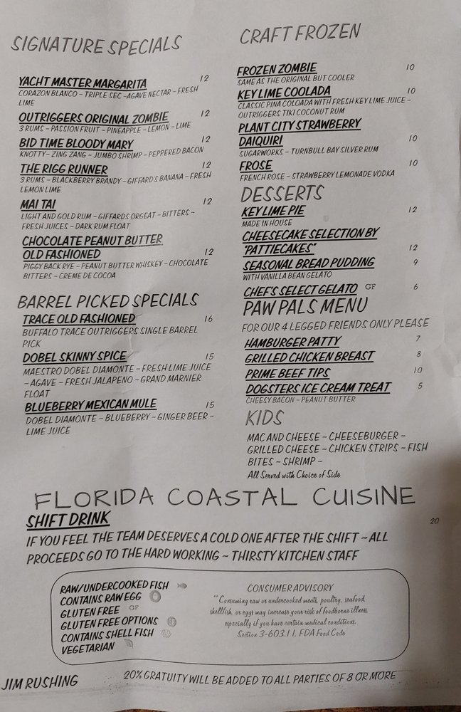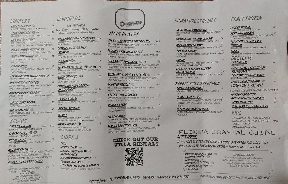 Don't miss out on their tantalizing desserts, such as the lava cake and the unique Walking Dead Key Lime Parfait. With an extensive drink selection, including a full bar and draft beer options, Outriggers ensures a delightful experience for families and friends alike.